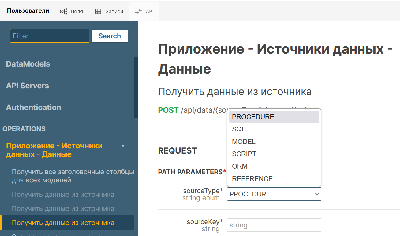 В закладке “API” редактора таблиц отображается описание методов интеграции и процедур, автоматически генерируемое на основании созданной модели данных. |