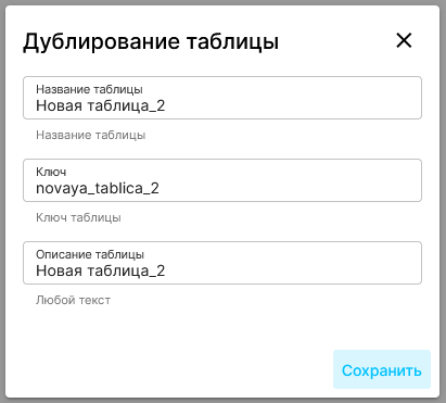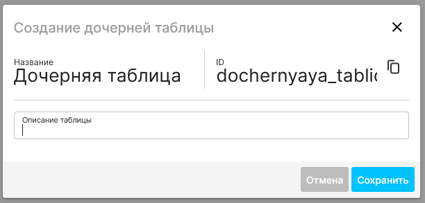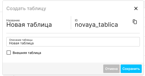 | Введите название таблицы и, при необходимости, ее описание (ID будет создан автоматически), нажмите “Сохранить”. | |