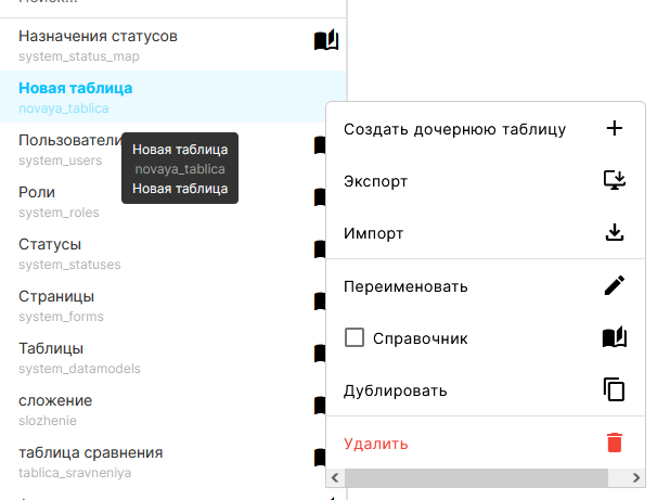 Закладка “Модель данных” левого меню Конструктора модели данных отображает список существующих таблиц*. Примечание: При создании нового приложения автоматически создаются несколько системных таблиц (ID начинается с "system_"). Из таких таблиц при необходимости можно получать ситемные данные, некоторые поля можно редактировать, изменение прочих полей заблокировано платформой. |