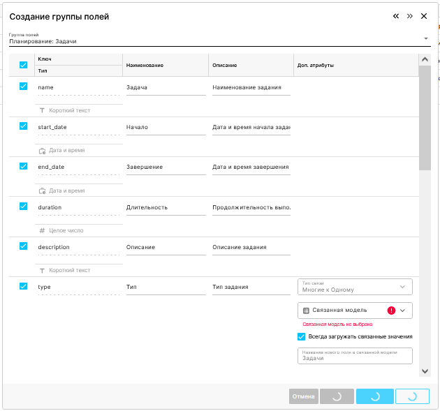 | Можно выбирать поля, которые собираетесь использовать, с помощью чекбокса; изменять наименование, описание и настраивать связи с другими таблицами. | |