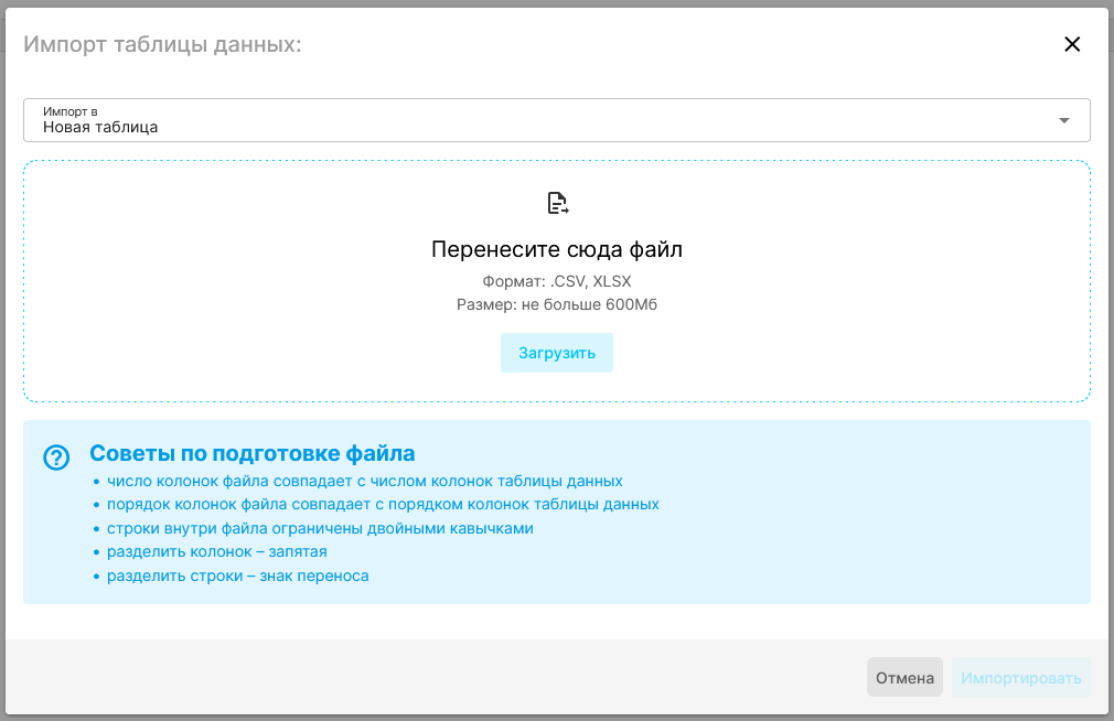 - импортировать данные в таблицу из файла формата csv или xlsx ( при этом должны быть соблюдены описанные в диалоговом окне требования);