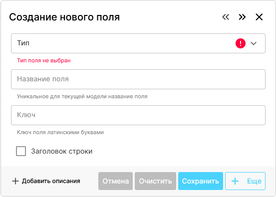Кнопка “+ Еще” позволяет перейти к созданию следующего поля, не закрывая диалоговое окно. |