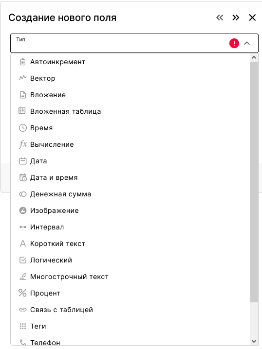 | Далее нужно выбрать из выпадающего списка тип поля. | |