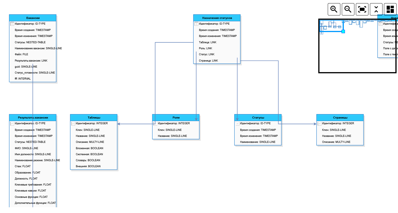 Закладка “ERD” левого меню конструктора модели данных. здесь отображается автоматически генерируемая схема созданной модели данных: таблицы с описанием содержащихся в них глобальных переменных, связи между таблицами. |