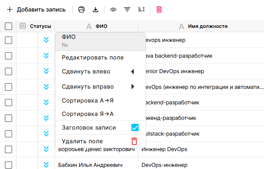 | Также можно осуществлять перемещение полей таблицы влево-вправо, сортировку по возрастанию-убыванию, удалить поле или отметить его как заголовок (для отображения в связанных таблицах), нажав левой клавишей мыши на заголовок столбца. | |