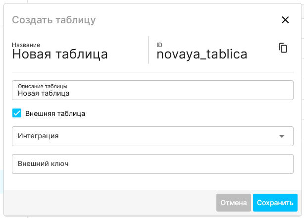 | Можно указать, что таблица является внешней, в этом случае система предложет настроить необходимую интеграцию по API (интеграция должна быть создана заранее). | |