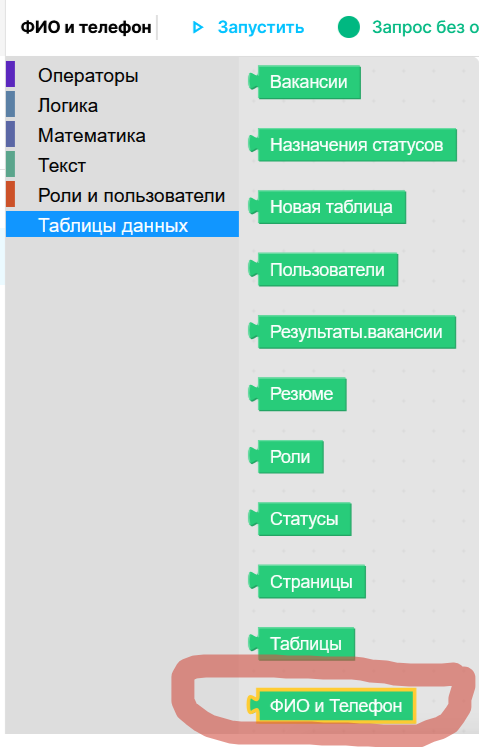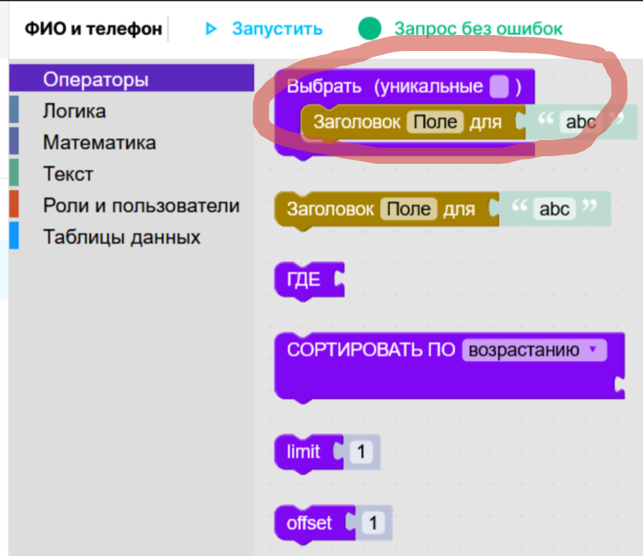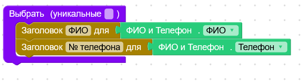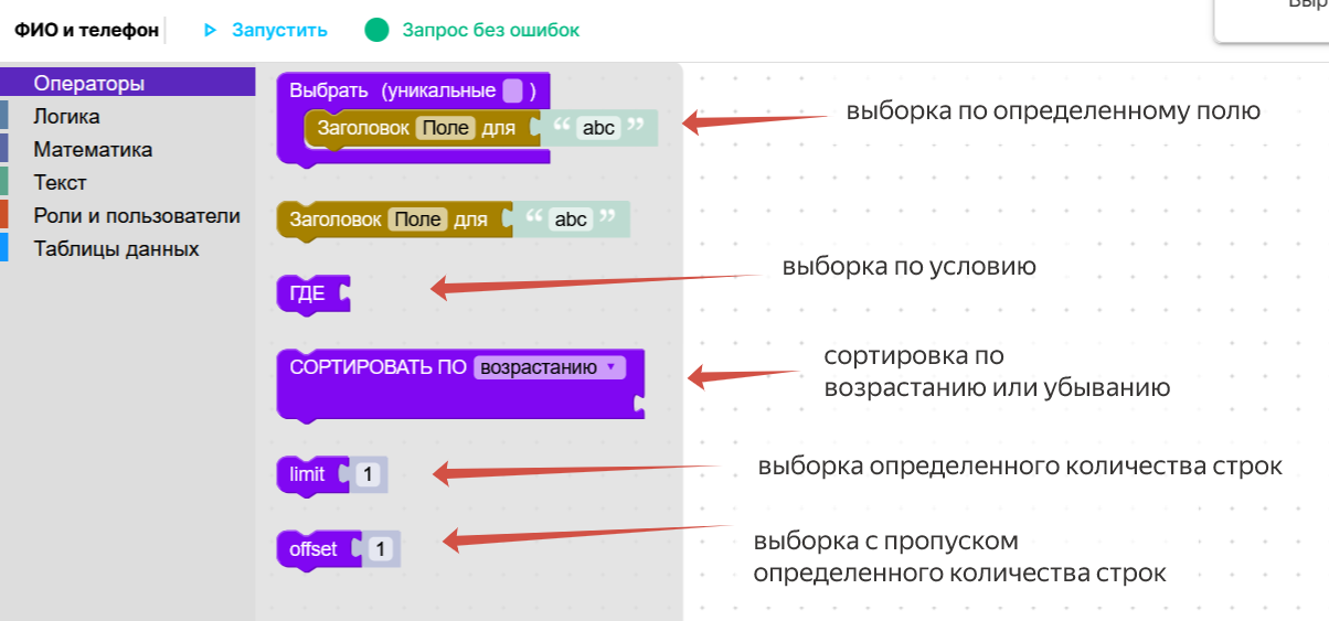 | Блоки из коллекции “Операторы” предназначены для осуществления выборки из таблиц. | |