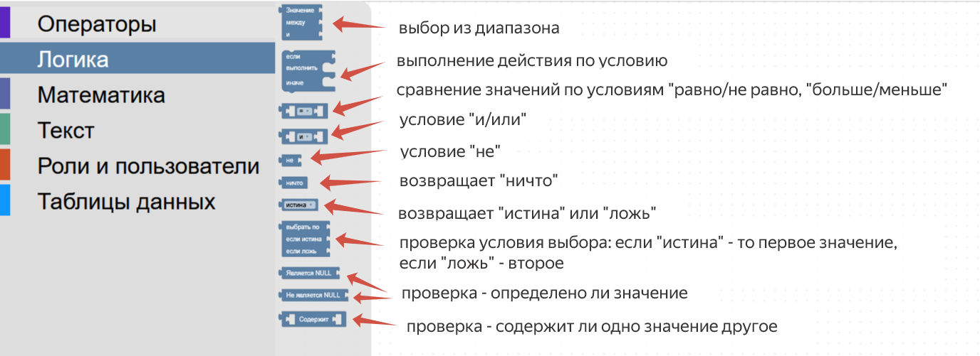 | Коллекция “Логика” содержит блоки, позволяющие структурировать данные в представлении и подвергать данные различным логическим операциям. | |