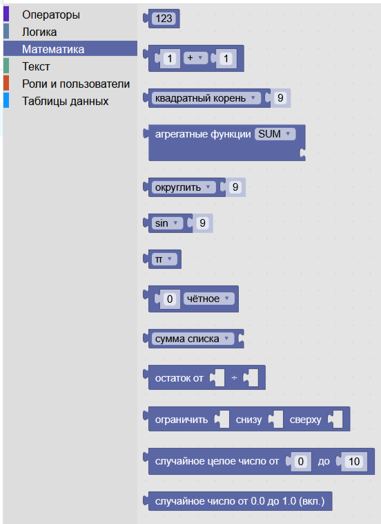 | Коллекция блоков “Математика” позволяет оуществлять всевозможные математические операции с числовыми табличными данными. Сложение, вычитание, деление, умножение, нахождение корней и модулей, определение синуса, косинуса и т.п., округление, определение случайного числа и так далее. Более подробная информация об использовании математических функций представлена в разделе Блоки конструктора представлений. | |